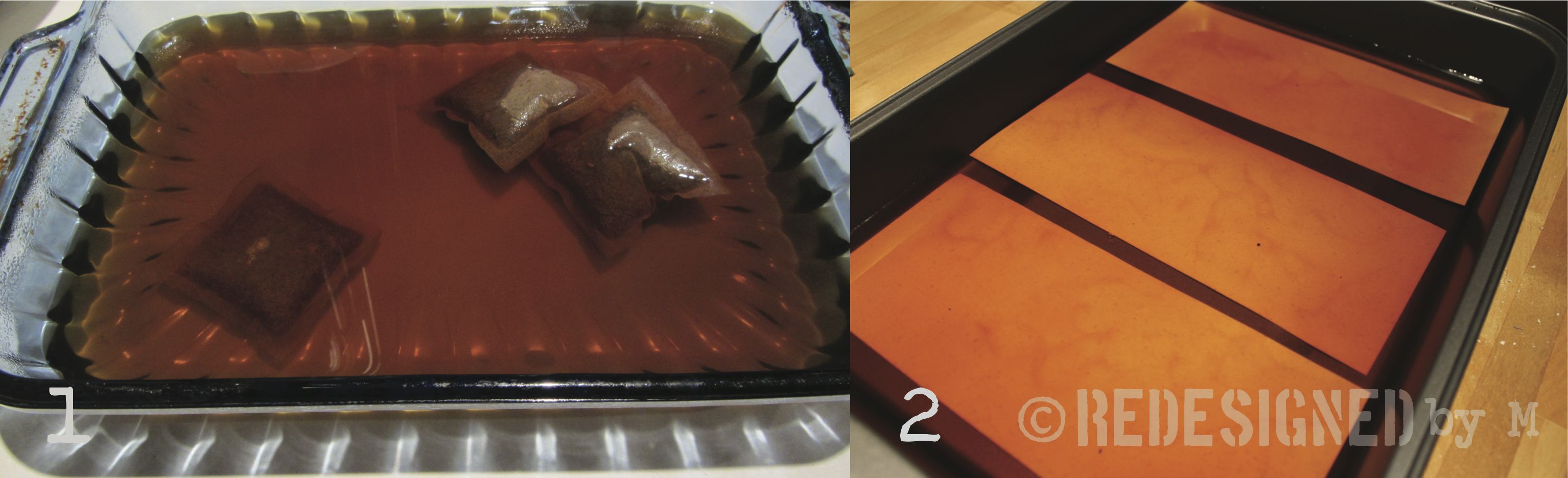 Prepare the tea bath. Using black tea bags, pour hot water over them in a flat pan. Hot water draws out the tea much better than cold, therefore creating a darker stain.