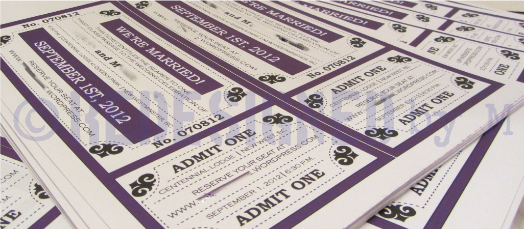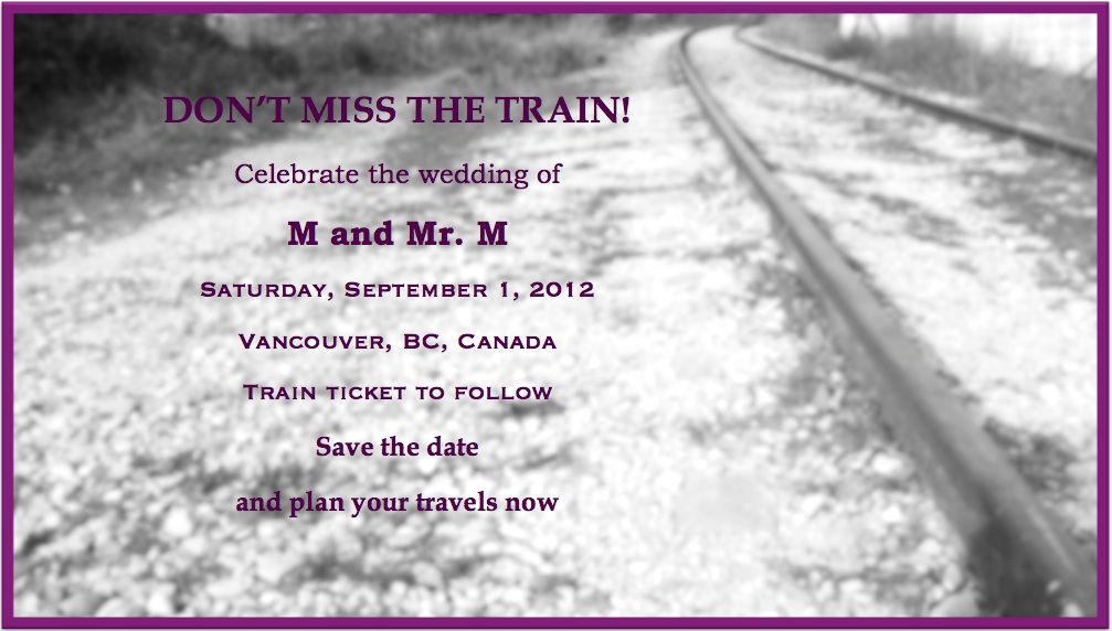 Along the lines of the “train ticket” as indicated in the StD, our wedding invitation was just that. Each guest was instructed to bring their tickets with them in order to be granted access. The ticket was perforated with a stub that would be torn off at the arrival to the reception, much like a real train ticket.