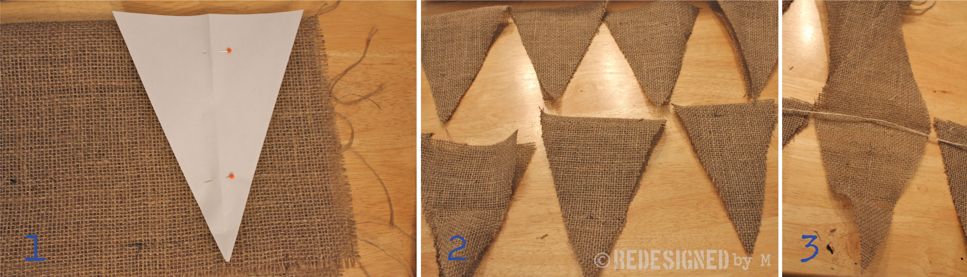 Step 2: Cut the triangles. Fold your fabric (I used burlap) and lay the long edge of the template at the fold (as shown in Step 1). There’s no need to trace the template onto the fabric. Pinning the template to the fabric is good enough. Cutting with pinking shears is the best way to avoid fraying. This way, you don’t have to hem the edges - why do more work than you need to, right? Plus, they’re just really fun to use.