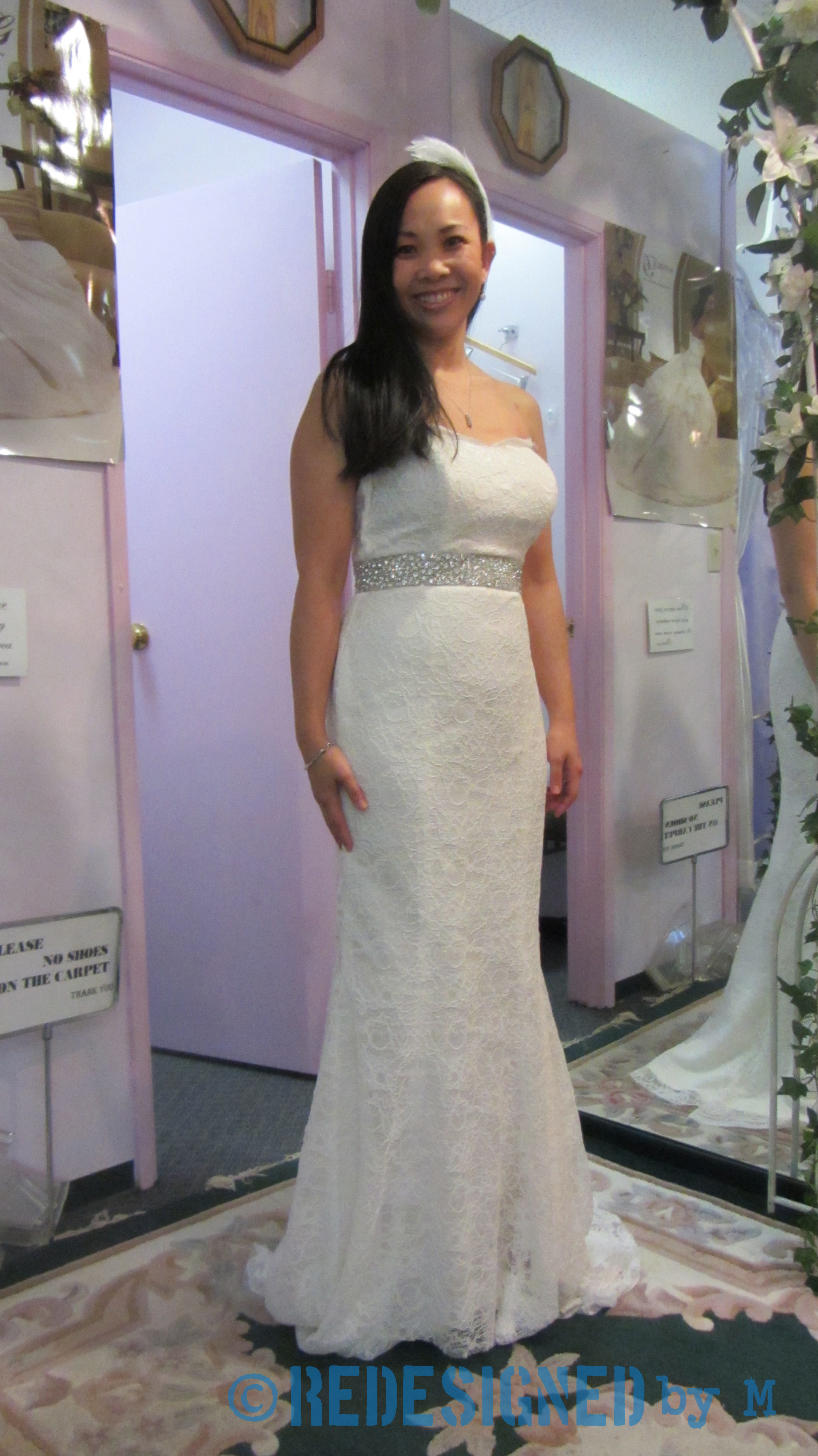 Goodwill has a seven-day return policy, so I took it home, tried it on for my friends, and pondered the logistics of turning the dress into something fitting for the lavender fields of Provence. In the end, I determined all it needed was a good dressmaker, a few yards of lace, and to lose a few inches around the waist before the big day. Here is what the dress looked like at the first fitting: